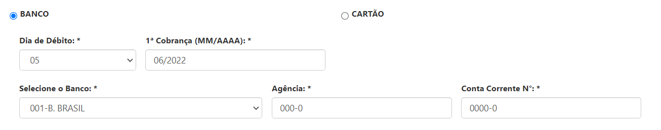 No preenchimento dos dados de pagamento, só aceitamos cartão de crédito e banco
